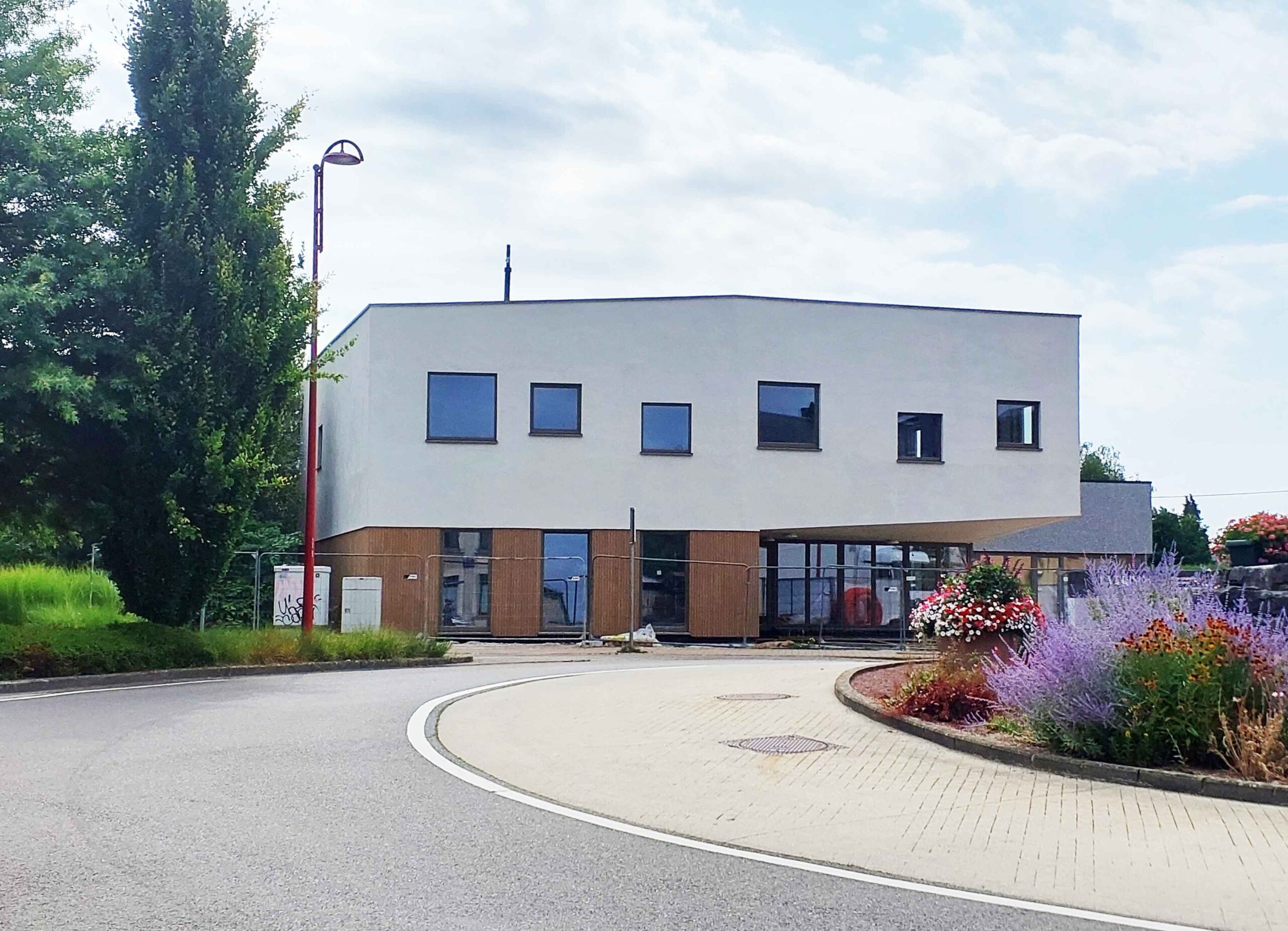 Fin du crépis juste avec les congés du bâtiment. Ouverture du centre prévue pour septembre 2025. Crépis à base de chaux et pose atrisanale frotté.